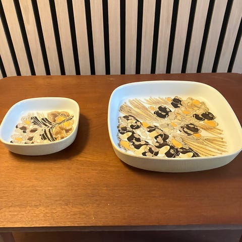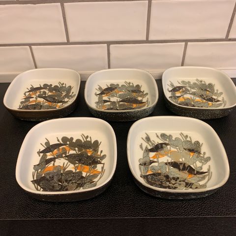 Royal Copenhagen fajance skåle i kvadratisk form med dekoreret inderside. Den ene skål har blå og grøn dekoration med central cirkulær udsmykning, den anden skål har brun grafisk dekoration opdelt i felter. Begge skåle er mærket Royal Copenhagen Fajance på undersiden med model- og dekornumre. Størrelsen er omkring 16 cm på hver side, velegnet som små serveringsskåle eller dekorative skåle.samt tilhørende vase med