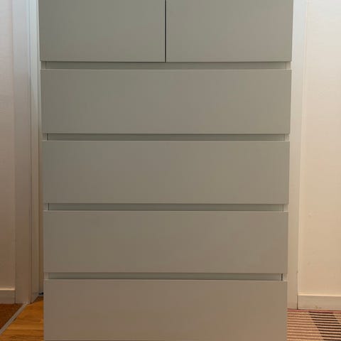 IKEA kommode i hvid. Kommoden har et enkelt, moderne design med glatte fronter og lige kanter. Den egner sig til opbevaring i soveværelse, entré eller stue, og kan bruges enkeltvis eller som sæt. Overfladen er glat og let at tørre af. Designet til praktisk opbevaring af tøj, tekstiler eller andre mindre genstande.