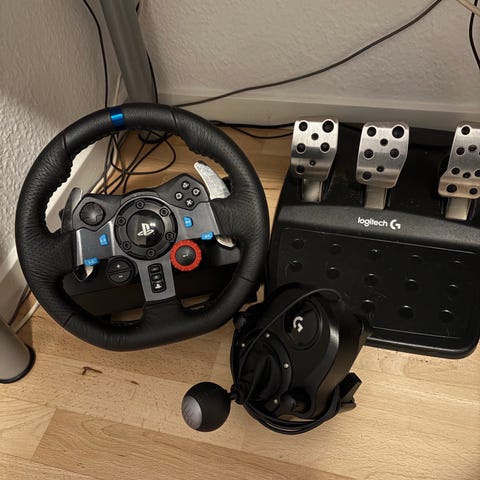 Logitech G29 racingrat og pedaler i sort. Sættet består af et rat med flere knapper og drejeknap samt et pedalsæt med tre pedaler monteret på en base. Egnet til brug med racingspil, hvor der er behov for præcis styring af gas, bremse og kobling. Velegnet til opsætning på skrivebord eller lignende flade.