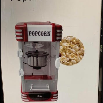 Popcornmaskine med en effekt på 1450W. Egnet til tilberedning af popcorn derhjemme eller ved mindre arrangementer. Maskinen leveres i kabinetform med tydeligt markeret topsektion og frontlåger ifølge emballagens illustration.