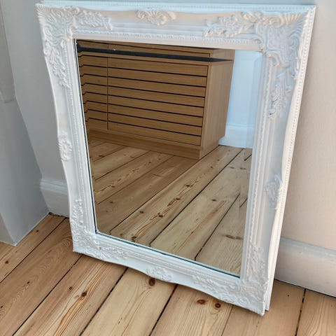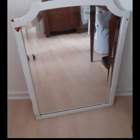 Klassisk gammelt spejl med en speciel form, der næsten minder om et skjold/våbenskjold.