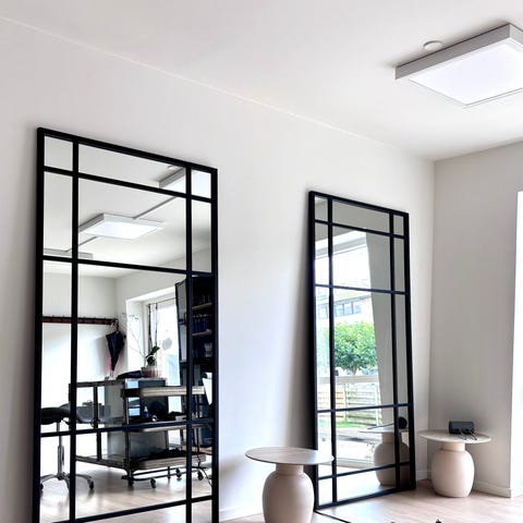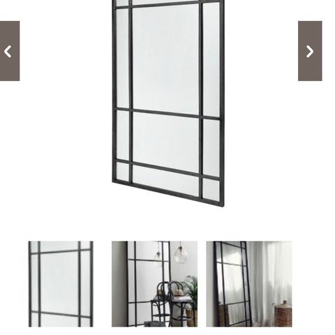 Nordal spejl med guldfarve. Spejlet består af flere spejlpaneler opdelt af en rektangulær ramme, som giver et new Yorker udtryk. Velegnet som vægspejl i soveværelse, entré eller stue. Rammen er i metal-look med mindre brugsspor, som kan ses på billederne. Spejlet kan bruges både dekorativt og funktionelt til fuldkropsspejling.