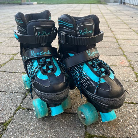 Rulleskøjter in-line til børn i størrelse 29-32. Rulleskøjterne har justerbare spænder og lukning over foden samt støtte omkring anklen. Egnede til børn, der ønsker at køre på rulleskøjter til leg og motion udendørs på jævne underlag. størrelse kan justeres ved at trykke på knappen.