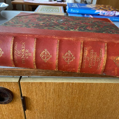 To bøger med hårde omslag. Den ene er mørkeblå med guldtryk, den anden er grøn med slidt omslag.