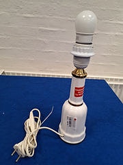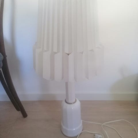 Lampeskaftet er hvidt med messingdetaljer. Det har en klassisk form.