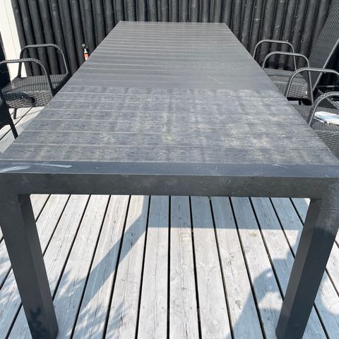 Havebord i træ med rektangulær bordplade og sorte metalben. Bordpladen består af massive træplanker med synlig årestruktur i en varm, naturfarvet tone. Benene er skråtstillede og giver bordet et stabilt underlag. Velegnet også om spisebord i køkken eller spisestue, og kan også bruges som arbejds- eller mødebord afhængigt af behov og plads. Har kun stået indendøre.