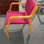 Stolen har en træramme med detaljeret udsmykning. Betrækket er i rød, mønstret tekstil.