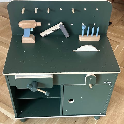 Flexa legeværksted i træ. Sættet består af en værkstedsbænk med opbevaringsrum og hylder samt perforeret bagplade til ophæng. Medfølgende trætilbehør som værktøjskasse, lineal og skruenøgler.