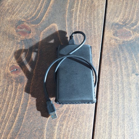 Verbatim ekstern harddisk i sort kabinet. Enheden tilsluttes via USB og har separat strømforsyning med medfølgende strømadapter og kabler. Harddisken er egnet til lagring og backup af data fra f.eks. computer eller medieafspiller. Kabinettet har ventilationshuller i bunden for bedre varmeafledning. Nærmere kapacitet og modelbetegnelse fremgår ikke af billederne.