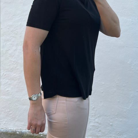 T-shirt til kvinder i sort ruskindsmateriale i størrelse L. Modellen har rund hals og korte ærmer. Materialet har en blød, ruskindslignende overflade. Velegnet som enkel overdel til hverdag eller mere formelle outfits afhængigt af styling.