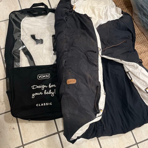 Voksi sleeping bag with winter duvet. Recently dry cleaned and ready for its new owner. Sold because it no longer can be used by our son and is in very good condition. Suitable for up to two years and comes with a carrying plate. Black on the outside and white with black spots on the inside.