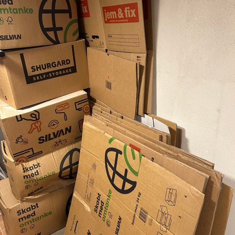 Papkasser i blandede størrelser, velegnet som flyttekasser eller til opbevaring. Kasserne er af pap og kan bruges til pakning, opbevaring eller forsendelse af forskellige typer indhold afhængigt af størrelse og behov.