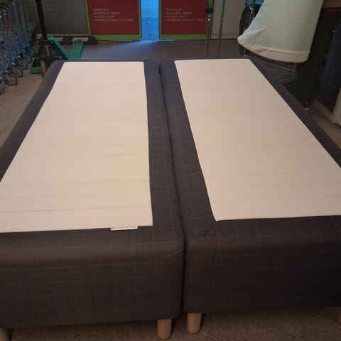 Ikea Stavanger + topmadras Polar fra Bedre Nætter. Der er også et stykke man kan komme imellem sengene, når de står sammen. Sengene har massive egeben. Den ene madras har mistet noget af farven på siden, men det er udelukkende kosmetisk, og kan ikke ses, når sengene står sammen. (Se sidste billede) Ingen pletter, eller skjolder! Nypris for sengene, der er knapt 5 år gamle var 5,800 Topmadrassen, der er 7 cm. tyk, er kun 5 måneder gammel, og koster 4248 kr. Har desuden en rullemadras, der er helt ren, men slidt. Den følger med gratis, hvis interesseret.