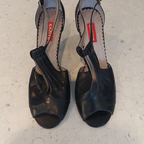 Gestuz sandaler i størrelse 37. Sandalerne er i sort materiale med ankelrem og spænde. De har blokhæl og åben tå med krydsremme over forfoden. Velegnet til brug ved både hverdag og mere formelle lejligheder. Materialet er ruskind.