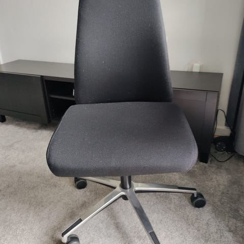 NY PRIS - FØR 350 kr. Polstret kontorstol på hjul i grå/hvid stofbetræk. Stolen har høj ryglæn og formstøbt sæde for støtte ved siddende arbejde. Hvid drejefod med fem ben og hjul, velegnet til brug ved skrivebord eller mødebord i kontor eller hjemmearbejdsplads. 350 kr. pr. stk. - 7 stk. i alt