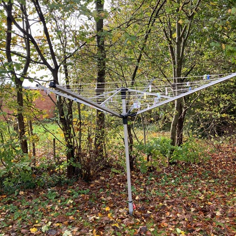 Tørrestativ til udendørs brug. Velegnet til opsætning i have eller gårdhave til tøjtørring. Stativet har flere arme til ophængning af tøj med snore eller klemmer. Kan placeres i jorden på et fast underlag.