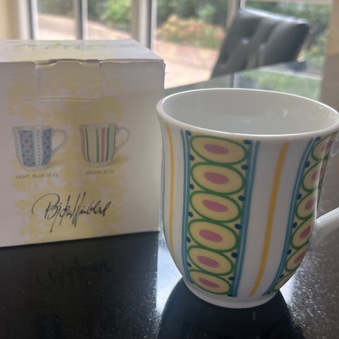 krus i porcelæn med grafisk ansigtsmotiv. Krusene er hvide med dekoration i blå og grøn farve på ydersiden. Sælges 5 samlet