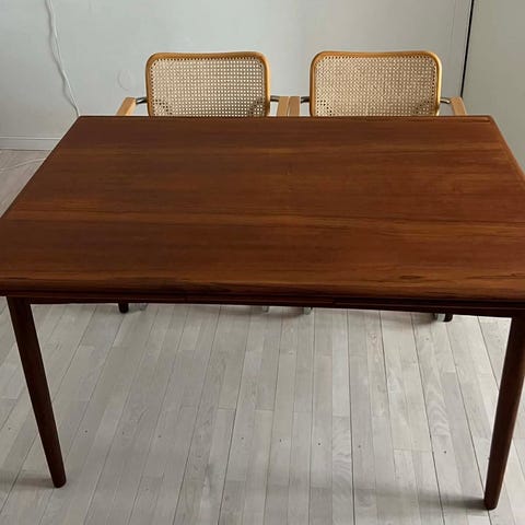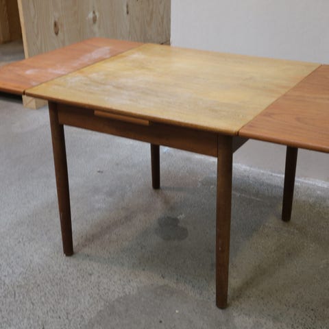 Trænger nok til en slibning og olie af bordpladen. Der er en smule farveforskel på bordpladen og udtrækspladerne, hvilket ses på billede 3.