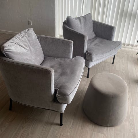 2 Lounge stole købt i ILVA 2020, var mere til pynt end til brug. Fremstår som nye. Ikke ryger lokale. Købspris 1000 kr. / stk.