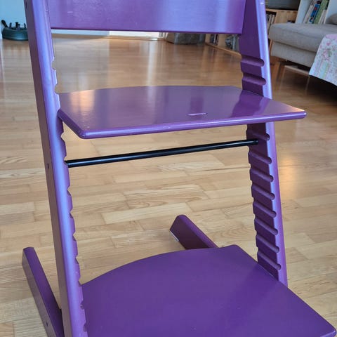 Tripp Trapp højstol i træ i to farver: én i grøn og én i sort. Begge stole har justerbar siddeplade og fodplade, så de kan tilpasses barnets højde. Den grønne stol er udstyret med bøjle/sele-del til mindre børn, mens den sorte stol er uden bøjle. Stolene er velegnede til brug ved spisebordet og kan bruges gennem flere alderstrin ved at regulere pladernes højde.