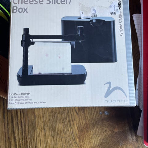 En praktisk flot sort boks med osteskærer, som på hotellernes brunchbord. Du skærer osteskiverne uden at røre ved osten. Der medfølger fire ekstra klinger og vejledning i klingeskift.