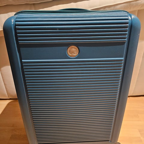 Har været brugt og har derfor et par skrammer. Se billeder. Men indvendig helt fin. Hjul, skydearm lynlås virker som de skal :)