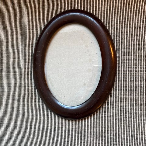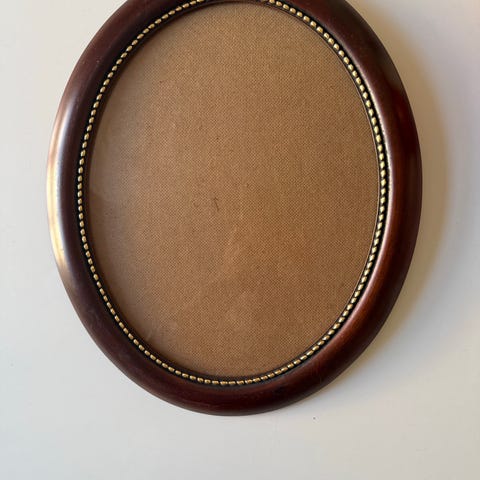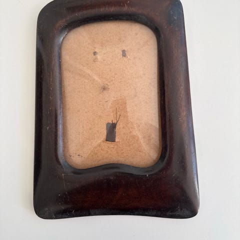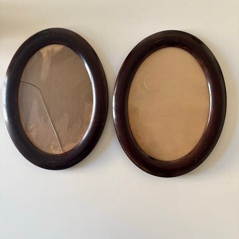 Sættet består af to små ovale, antikke fotorammer i mahogny. De kan anvendes som små vægophæng eller som dekorative elementer i indretningen. Bagsiden viser ophængsmulighed på den ene, mens den anden har to små huller til montering eller fastgørelse.
