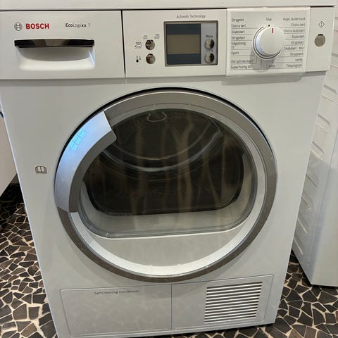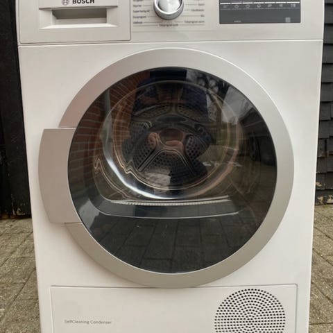 Bosch WTW875M8SN kondenstørretumbler i hvid. Frontbetjent model med rund glaslåge og elektronisk display med programvælger. Tørretumbleren er en kondensmodel, som opsamler fugten i en beholder eller via afløb, afhængigt af installation. Maskinen har rustfri tromle og flere tørreprogrammer, som kan vælges på drejeknappen og via betjeningspanelet. Egnet til almindelig husstandstørring af tøj og tekstiler, hvor der ønskes kondenstørring frem for aftræk.