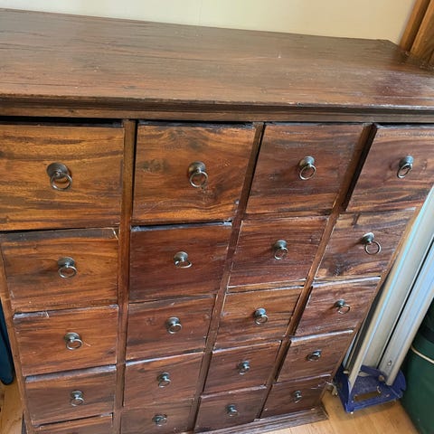 Flot kommode i massivt træ med 3 skuffer. Klassisk design med buede ben og originale greb. Kommoden er solid og stabil.