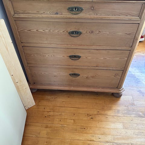 Sælger flot høj kommode i fyrretræ med 7 rummelige skuffer og klassiske runde træknopper. Perfekt vintage/retro look fra 70-80’erne – varm, naturlig fyrretræsfarve med fin åretegning, der passer super til nordisk hygge-indretning.
