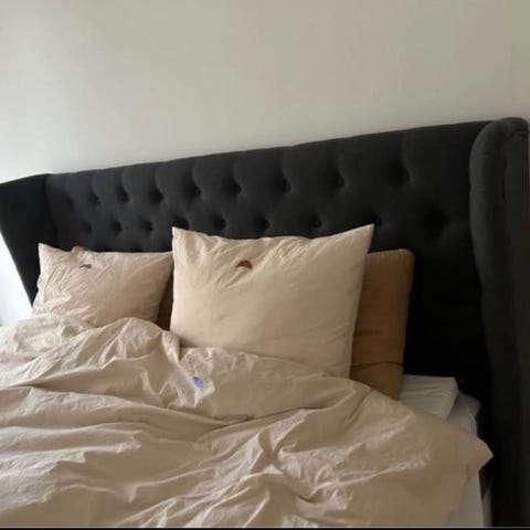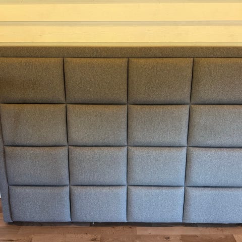 Jysk sengegavl i polstret lyst gråt stof. Sengegavlen har kvadratisk, knappet mønster på fronten og en glat bagside. Mål: 180 x 124 x 10 cm (B x H x D).