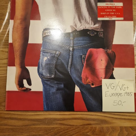 Bruce Springsteen Born In The U.S.A. lp vinyl. Studiealbum udgivet på pladeselskabet CBS. Med originalt cover med det amerikanske flag-motiv. Trackliste fremgår af bagsiden og label, herunder titler som "Born In The U.S.A.", "Cover Me" og "Dancing In The Dark".