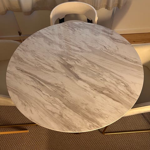Rundt spisebord fra Nimara. Har kun været brugt i 1 år. Marmor look. Har enkelt brugsspor (se foto) nypris: 999kr.