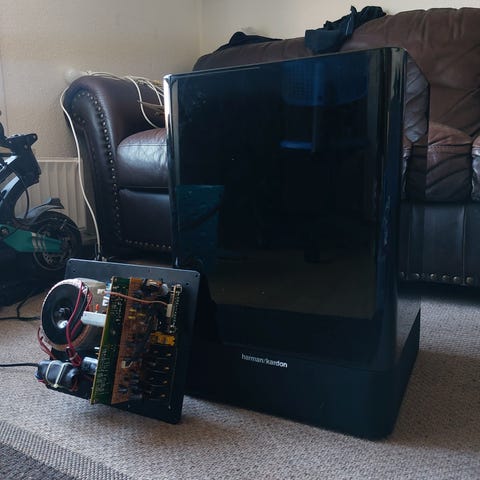 subwoofer i sølvfarvet kabinet. Aktiv subwoofer med indbygget forstærker og bundmonteret basenhed. På bagsiden findes tilslutninger til lydindgang samt strømtilslutning og betjeningsknapper. Velegnet som basmodul til lydsystem eller hjemmebiografopsætning.