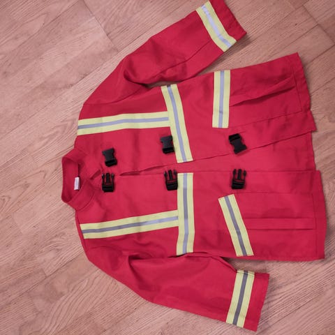 Fastlavn / udklædning Peter Pedal dragt i 3 dele og Mandens gule hat. Vi har selv syet og fremstillet alle delene.