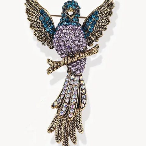 Forgyldt fuglebroche forestiller en papegøje, små rhinstene om hoved og det øverste af vingerne,, har aldrig været brugt , måler 6,,5 cm.