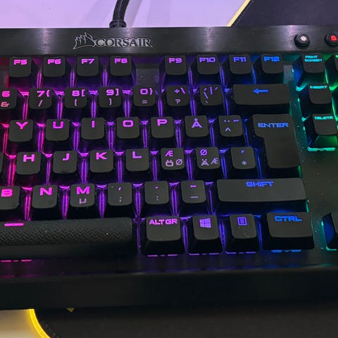 Keyboardet har RGB-belysning både i tasterne samt rundt om keyboardet (underglow/sidebelysning), som kan tilpasses via Corsair iCUE – se billeder.