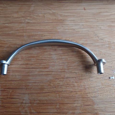 3 forskellige typer håndtag i metal til skabe og skuffer. Håndtagene er buede og i en lys metalfarve.