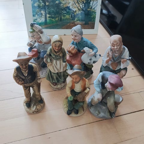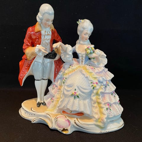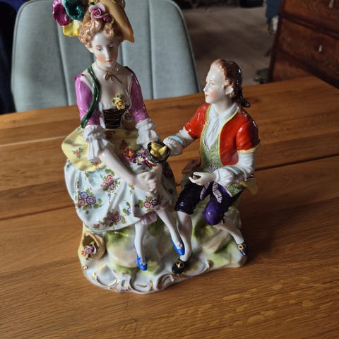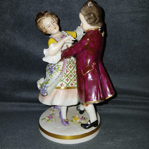 Porcelænsfigur af dansende par i historiske dragter. Figuren forestiller en mand og en kvinde i tidstypisk tøj, stående på en dekoreret fod. Overfladen er glaseret og dekoreret med flere farver og mønstre. Velegnet som pyntegenstand i fx stue, vitrineskab eller samling af figurer. Bunden viser markeringer og hulrum typisk for støbt porcelæn.