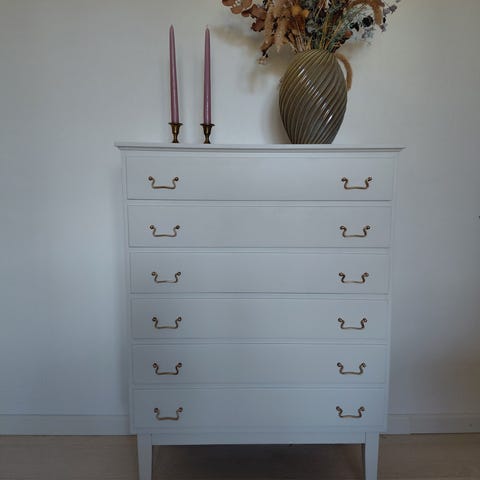 Smuk antik kommode med 4 skuffer. Er malet i en cremet hvid farve og har nogle smukke messing detaljer. Skuffer kører som de skal. Er lidt skraber hist og pist, som man evt kan male over.