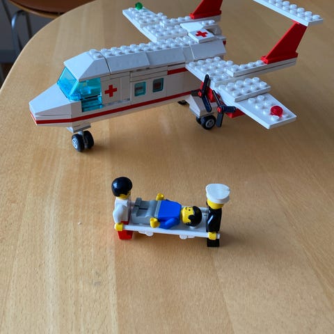 LEGO City 60465 legetøjssæt med ambulancefly. Sættet består af et redningsfly med åbent kabineområde, bårer og medicinsk udstyr samt flere minifigurer, herunder piloter og redningspersonale. Byggesættet indeholder 403 dele og er velegnet til leg med rednings- og nødsituationer i et vinter- og bjergmiljø.