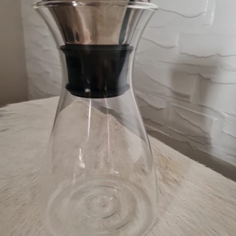 Eva Solo karaffel i klart glas med metal- og silikonedetalje ved halsen. Karaffelen har en bred bund og smal hals, som gør den velegnet til servering af vand, juice eller andre kolde drikke ved bordet eller i køkkenet. Designet er enkelt og funktionelt, og den gennemsigtige glasoverflade gør det let at se indholdet.