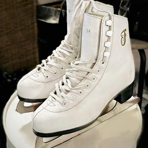 kunstskøjter i størrelse 34. Klassiske hvide skøjter med snørelukning og sort hæl.