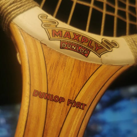 Træketcher med flere år på bagen og derved en flot patina. Kan bruges til at spille tennis med, men kan også sagtens bruges som dekorativ kunst på væggen.