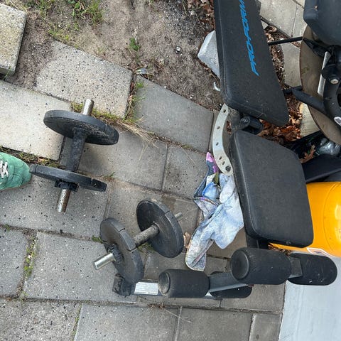 Sættet består af en bænkpresbænk med stativ, hvor der er holder til vægtstang. Der medfølger en lang vægtstang monteret på stativet samt flere løse vægtskiver i forskellige vægtklasser, som kan ses på billederne. Der er også en separat vægtstang på gulvet med skiver.
