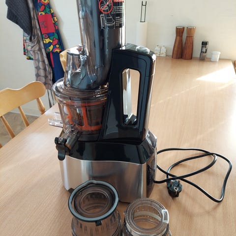 Cook & Baker saftpresser/slowjuicer, som jeg ikke har plads til. Kan lave juice, smoothies og sorbet. Modellen leveres med flere sigter/filtre til forskellige konsistenser samt beholdere til juice og frugtkød. Maskinens aftagelige dele gør den meget nem at gøre ren.