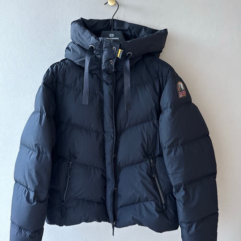 Parajumpers Long Bear dunjakke til kvinder i størrelse L. Jakken er mørkeblå og foret med dun og fjer. Modellen er en lang parka med aftagelig hætte med ægte pels, gennemgående lynlås foran samt trykknapper. Der er flere udvendige lommer og karakteristiske Parajumpers-detaljer som skulderpatch og gul rem ved halsen. Jakken er brugt meget lidt og har ingen brugsspor. En virkelig god vinterjakke til mange år.