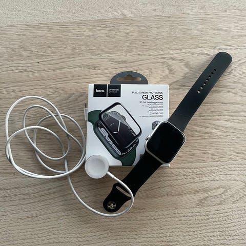 Apple Watch 6 44mm smartwatch i sort. Uret har sort rem og rektangulær skærm. Leveres med oplader og ekstra remstykke, som vist på billederne.