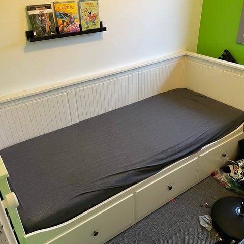 IKEA seng med opbevaring under sengen. Sengen har polstret gavl og integrerede skuffer eller rum til opbevaring langs siderne. Velegnet til soveværelse, hvor der er behov for ekstra opbevaringsplads til f.eks. sengetøj, tøj eller sko.