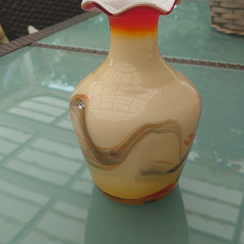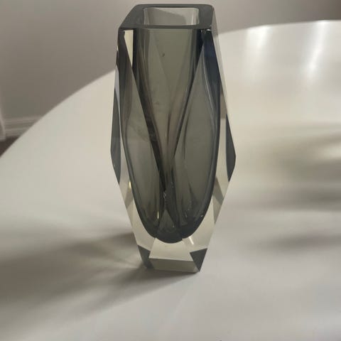 Murano Sommerso vase. Lilla og klart glas. I bunden er der i det ene hjørne et lille afslag og på selve bundkanten et par mikrohak. Derudover er der 2 medfødte uregelmæssigheder: en bristet boble på siden og ligeledes en bristet boble i hjørnet nede. Den sidste kan ligne et hak men er altså inde i glasset. Højde 17,5cm . Målder 7.5x7.5cm. Pris kr 100.
